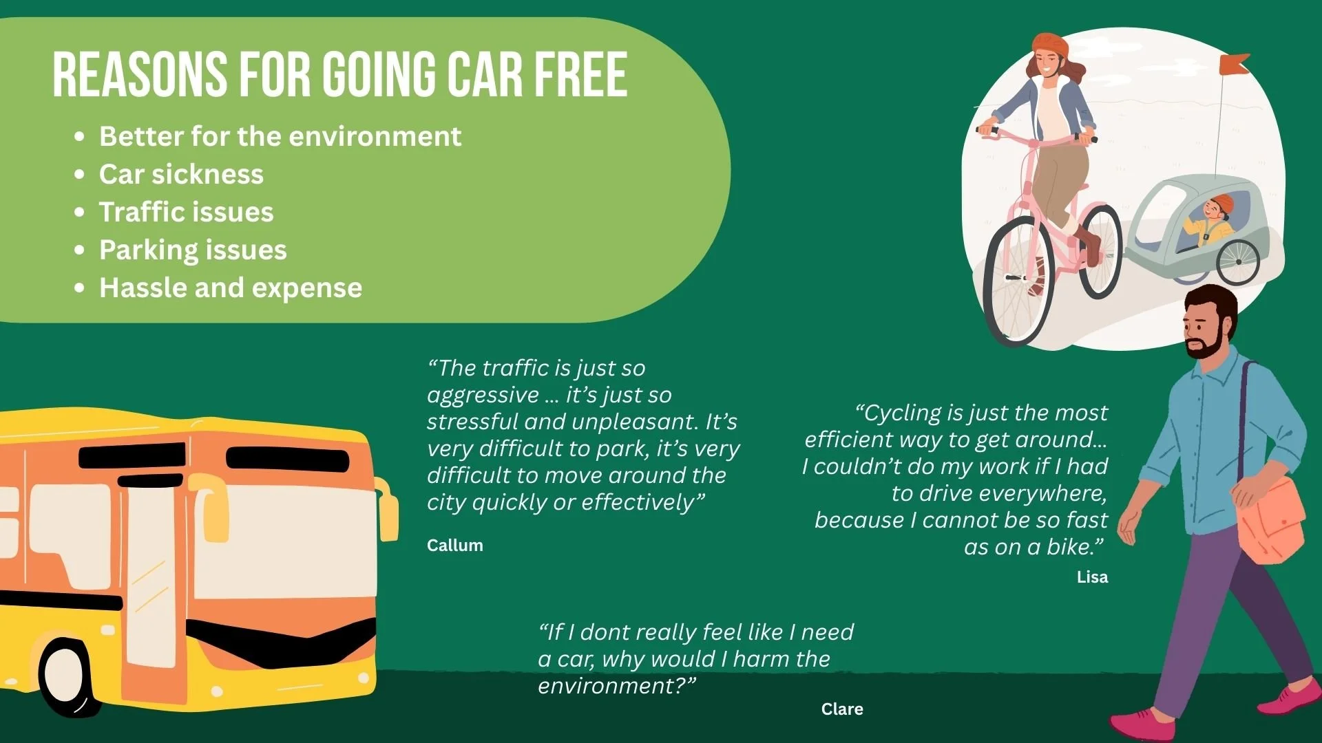 Some people were keen to avoid the expense and ‘hassle’ of car ownership, including the stress of unexpected large bills as well as the ongoing running costs. Only two parents said affording a car would be an issue, but they did not want one for other reasons.