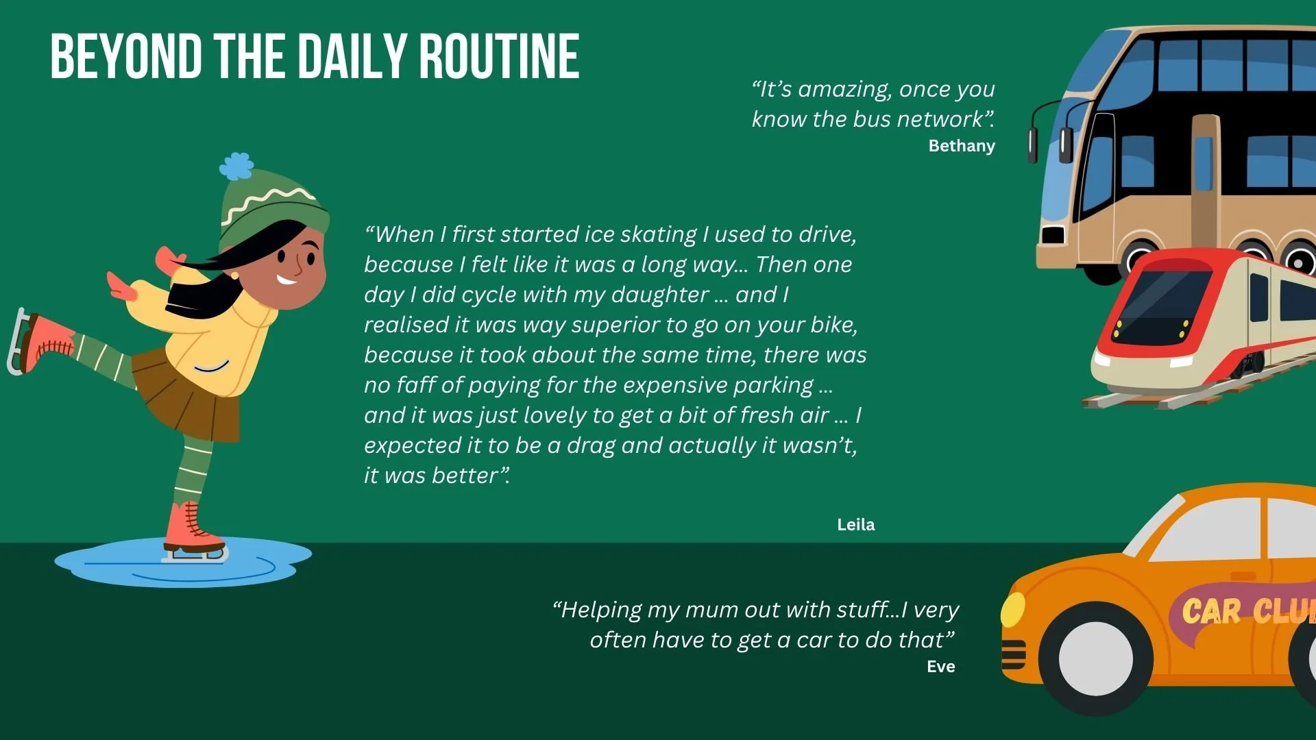 Finally, I spoke to parents about what they thought needed to change to make things easier for them and others who do not own a car. Parents had many suggestions, including making cycling conditions much safer, improving bus services and making them more affordable, and ensuring car clubs were available in all areas. There was a general concern that travelling by car was seen as the ‘default’ solution to travel, from planning infrastructure and organising events to society’s attitudes, and that this definitely needed to change.