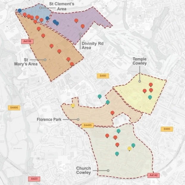 Three LTNs were created in the Temple Cowley, Church Cowley and Florence Park areas of Cowley in 2021. Three more were created in the Divinity Rd, St Clement's and St Mary's areas of East Oxford in 2022.
